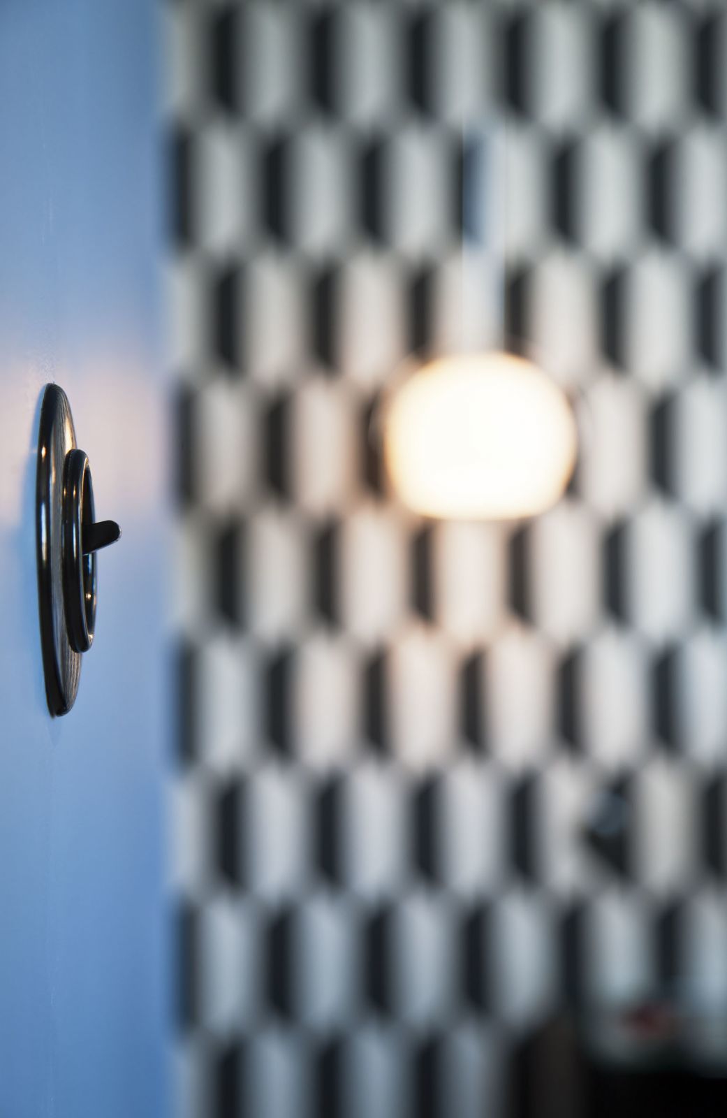 Genießen Sie ein geräumiges und komfortables Zimmer mit grafischem Design in Schwarz und Weiß an den Wänden und auf dem Boden und einer leuchtend blauen Decke. Auf der obersten Ebene des Gebäudes gelegen, bietet dieses Zimmer spektakulären Blick. Das Zimmer verfügt über ein offenes Badezimmer.
