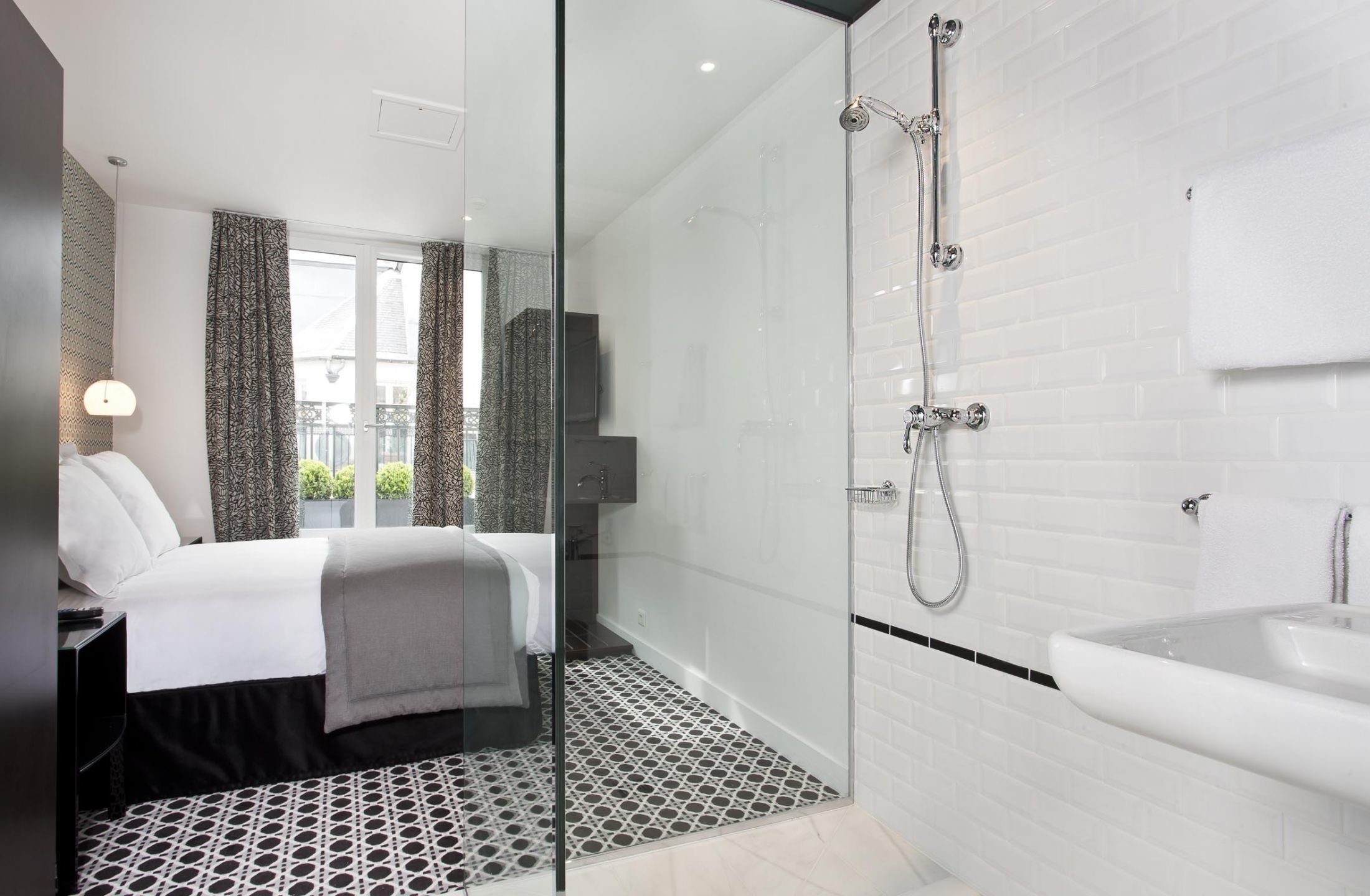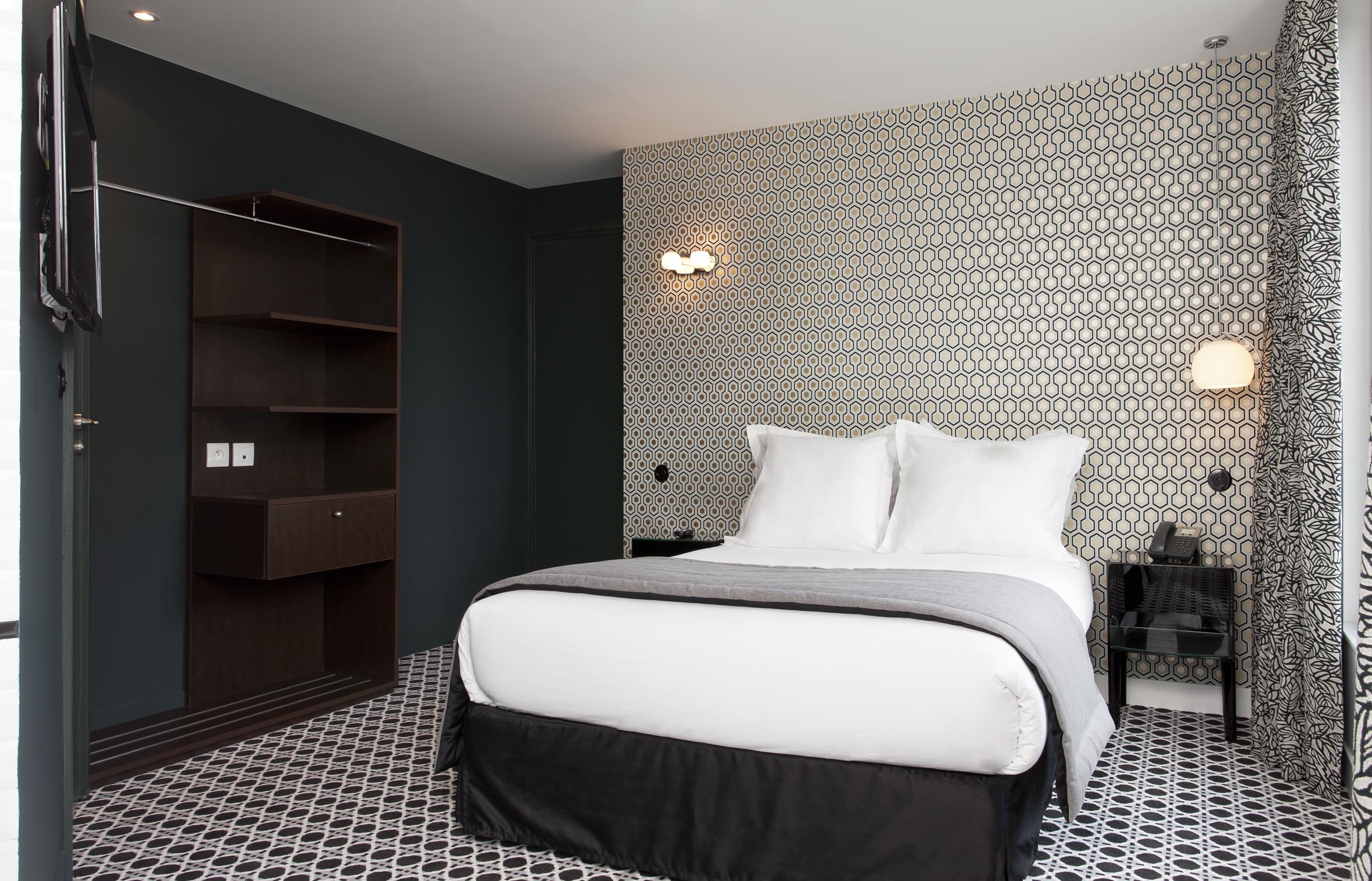Dekor im grafischen Stil heißt Sie in diesem komfortablen Zimmer willkommen. Doppelt verglaste französische Fenster lassen genügend Licht herein und sind durch typische pariserische Gitter aus Schmiedeeisen gesichert. Betten haben weiche weiße Decken und Kissen. Das Zimmer verfügt über ein offenes Badezimmer.